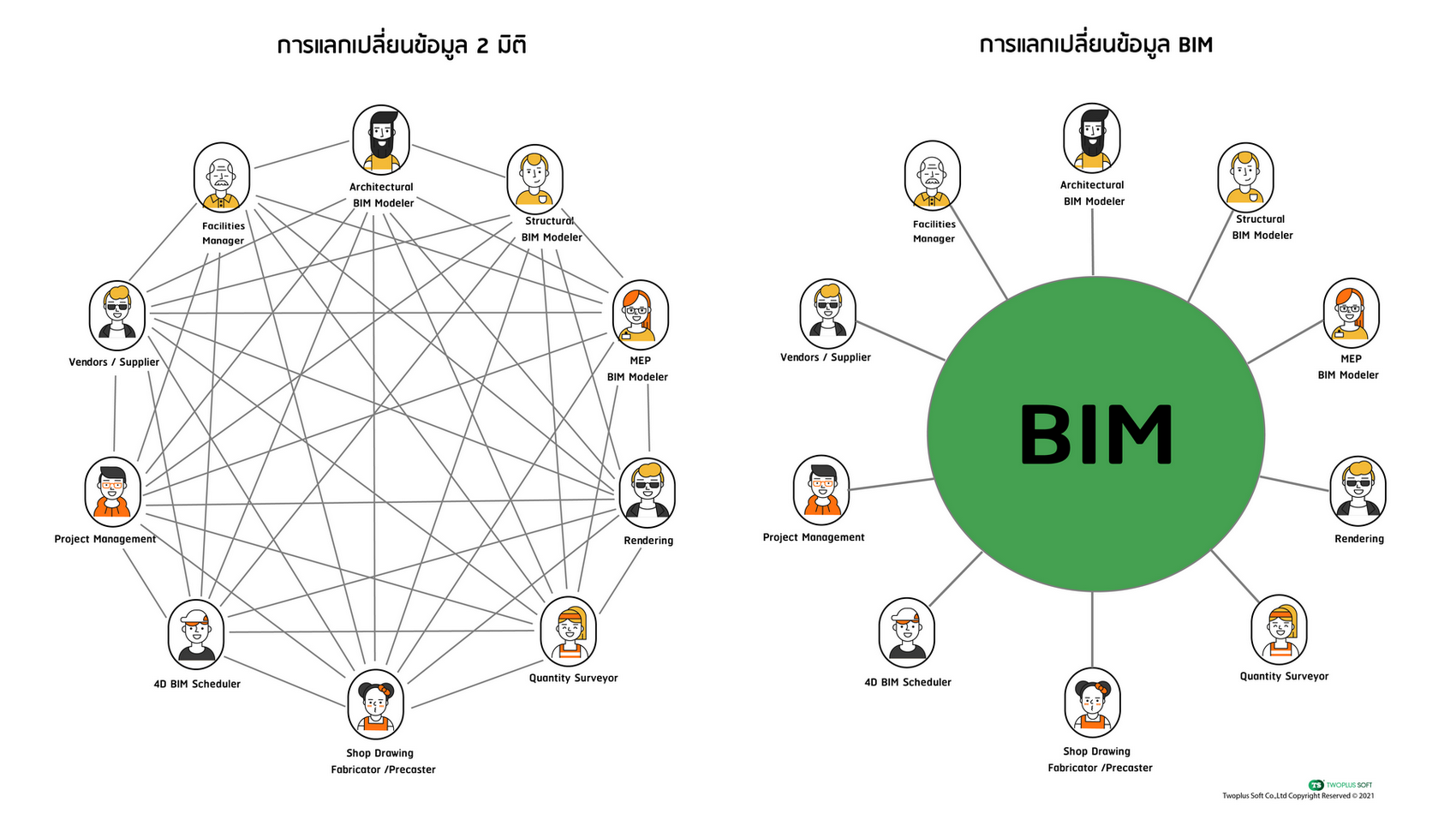 ภาพซ้ายมือ คือ การทำงานแบบเดิม ที่อาศัยการแลกเปลี่ยนข้อมูลทุกครั้งที่มีความต้องการ ทำให้เสียเวลา ต้นทุน แรงงานมาก และ มีโอกาสผิดพลาดได้สูง ทำให้แบบที่ได้ด้อยคุณภาพ ส่วนภาพขวามือ เป็นการสร้างโมเดลอาคาร BIM (Builing Information Modeling) เป็นการทำงานเป็นระบบ BIM ที่สามารถเป็นไฟล์กลางสามารถแลกเปลี่ยนกันได้กับทุกๆฝ่าย โดยอาจแลกเปลี่ยนโดยนามสกุลเดียวกัน หรือ การส่งออกเป็นนามสกุลกลาง IFC หรือ แม้กระทั่งการแลกเปลี่ยนโดยเทคโนโลยี ISM (Integrated Structural Modeling) ที่สามารถครอบไฟล์แล้วนำไปทำงานได้โดยไม่ตกหล่น