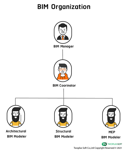 ผังองค์กรของ BIM Organization ซึ่่งแบ่งเป็น BIM Manager, BIM Coordinator , BIM Modeler ซึ่ง BIMTrack เป็นเครื่องช่วยให้ผู้เกี่ยวข้องทำงานประสานงาน แก้ไข BIM ที่ทำให้รวดเร็ว ประหยัดต้นทุนมากยิ่งขึ้น แทนการประสานงานด้วยมือ หรือ การประชุม หรือ แม้กระทั่ง Email โทรศัพท์ ซึงใช้ต้นทุนสูง แล้วต้องติดตามงานที่ประชุมไปแล้ว แก้ไขไม่ครบที่ประชุมกัน ทำให้เสียเวลา และเสียอารมย์มาก