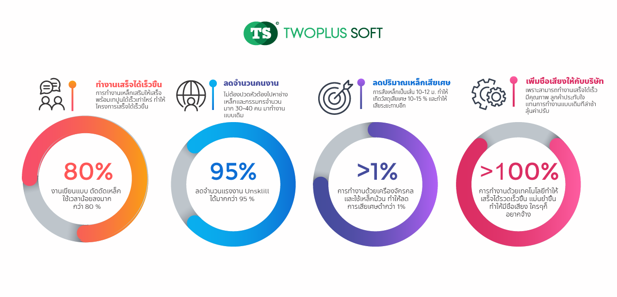 หากโครงการขนาดใหญ่ หรือ รูปทรงซับซ้อนแบบ 3 มิติ นั้นหมายถึง ต้องใช้เวลาในการเขียนแบบ ตัดและดัดเหล็กเสริมมากขึ้นไปอีกหลายเท่าตัว ปัจจุบันเทคโนโลยีทั้งซอฟท์แวร์และฮาร์ดแวร์สามารถเข้ามาแก้ไขปัญหาเหล่านั้นได้เป็นอย่างดี ทูพลัส ซอฟท์ฯ พร้อมเป็นที่ปรึกษาในการจัดทำเทคโนโลยีเหล่านี้เป็นโซลูชั่นที่ง่ายมากขึ้น