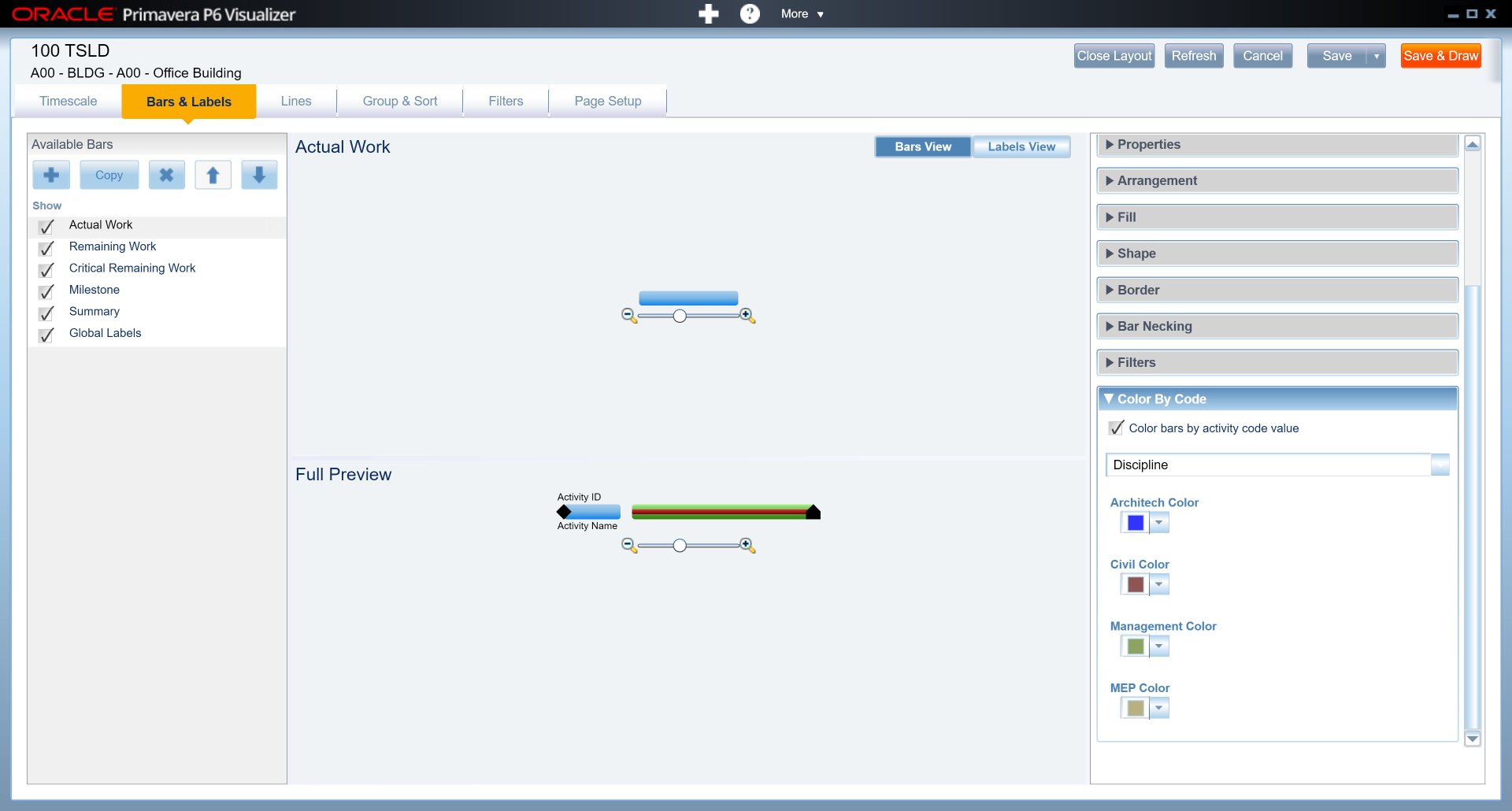 การกำหนดค่าสีของ Activity Code ดังกล่าวมีไว้เพื่อสร้าง Filter สีของ Bar Chart ในโปรแกรม Visualizer ซึ่งสามารถกำหนดสีของ Bar Chart เพื่ออ้างอิงกับ Activity Code ดังกล่าวตามภาพ