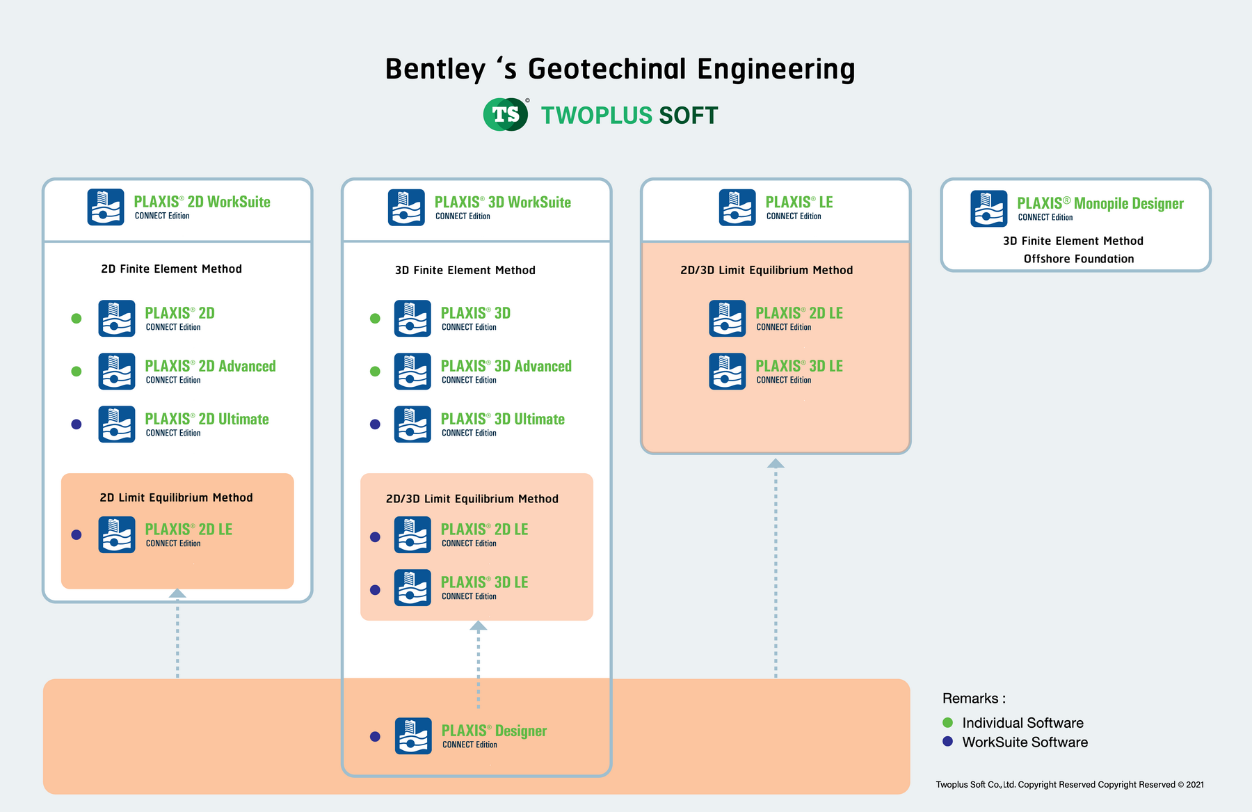 เป็นโซลูชั่นโปรแกรม PLAXIS 2D เข้าด้วยกัน ทั้ง PLAXIS 2D Ultimate ซึ่่งวิเคราะห์ด้วยวิธี Finite element แบบ 2 มิติ และการวิเคราะห์ด้วยวิธี LEM 2 มิติ PLAXIS 2D LE และ PLAXIS Designer