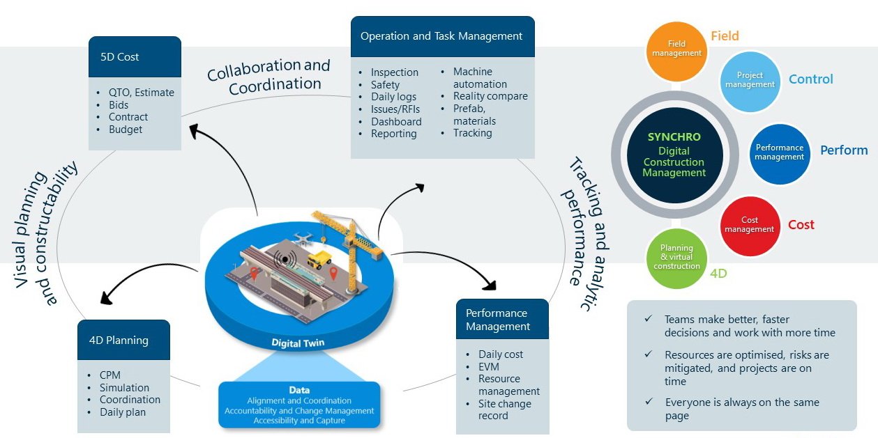 Synchro เป็นโปรแกรมโซลูชั่นในการทำงานก่อสร้างสมัยใหม่แบบดิจิตัล แทนการบริหารงานก่อสร้างแบบกระดาษ ซึ่งมีการบันทึกข้อมูลแบบกระจัดกระจาย โปรแกรม Synchro จากเดิมที่เน้นทำงานด้าน 4D BIM ชื่อ Synchro Pro จนเป็นที่นิยมทั่วโลกเนื่องจากมีเทคโนโลยีระดับ High End แตกต่างจากโปรแกรมอื่นๆ ซึ่งเป็นระบบ entry level เป็นส่วนใหญ่ ซึ่งปัจจุบันได้พัฒนาเพิ่มเติมให้ทำงานได้ครบวงจรการทำงานก่อสร้าง ซึ่งมี 5 โมดูล